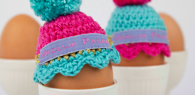 Brei, haak of koop een klein mutsje voor het eitje en werk het af met een geweven naamlabel. Dit geeft je creatie een luxe uitstraling en maakt het helemaal passend bij jouw stijl.
