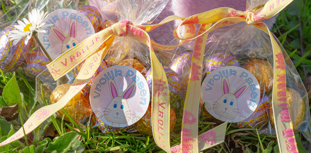 Gebruik kleine zakjes of doosjes en vul ze met paaseitjes. Maak ze vervolgens uniek met gepersonaliseerde stickers waarop je een naam of een leuke foto zet. Voeg daarnaast een tekstlint toe om het zakje mooi af te werken. Zo creëer je eenvoudig een originele paastraktatie.